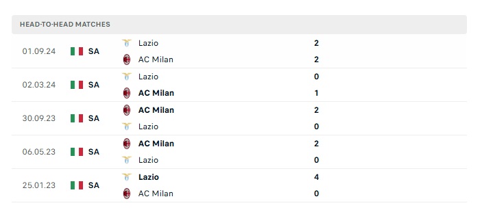- Kèo tỷ số H2 AC Milan vs Lazio: 2-1