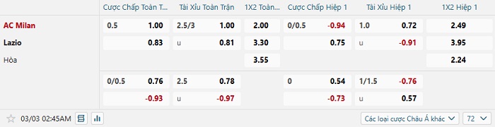 Bảng tỷ lệ kèo bóng đá AC Milan vs Lazio