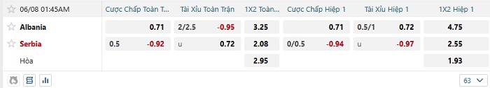 Bảng tỷ lệ kèo nhà cái Albania vs Serbia
