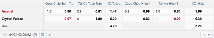 Bảng tỷ lệ kèo bóng đá hôm nay Arsenal vs Crystal Palace