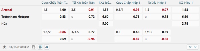 Bảng tỷ lệ kèo bóng đá Arsenal vs Tottenham