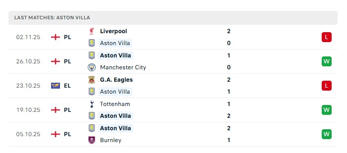 - Phong độ gần đây Aston Villa