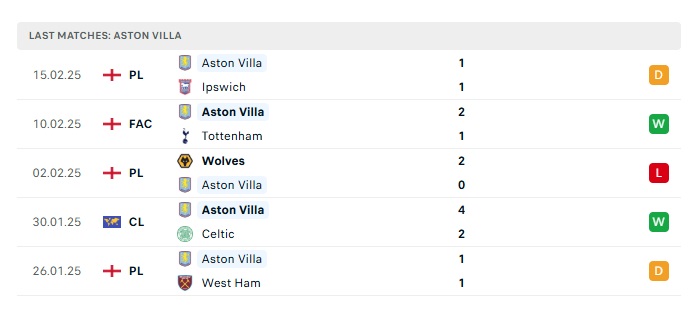 • Phong độ gần đây Aston Villa