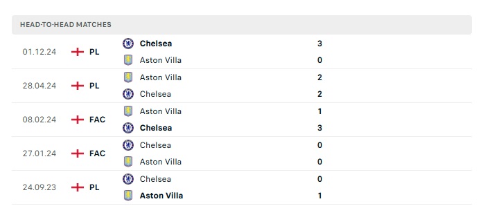 Lịch sử đối đầu Aston Villa vs Chelsea