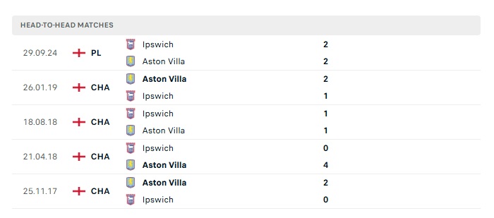 Lịch sử đối đầu Aston Villa vs Ipswich