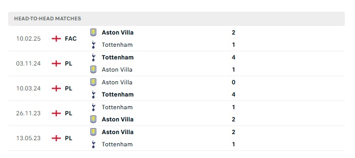 Lịch sử đối đầu Aston Villa vs Tottenham