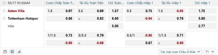 Bảng tỷ lệ kèo bóng đá hôm nay Aston Villa vs Tottenham