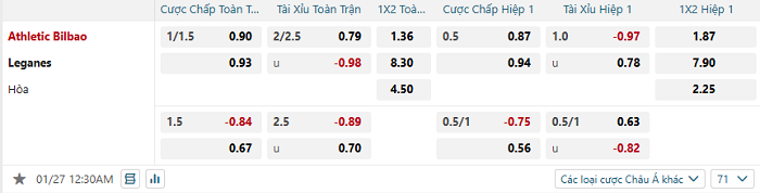 Bảng tỷ lệ kèo bóng đá Athletic Bilbao vs Leganes