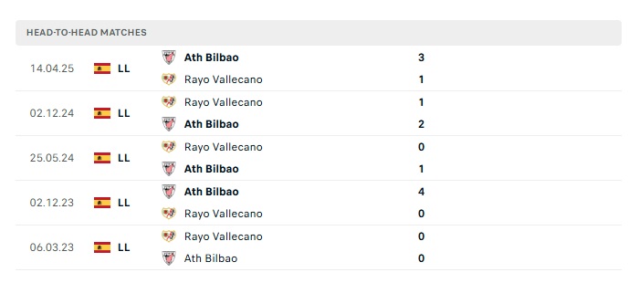 Lịch sử đối đầu Athletic Bilbao vs Rayo Vallecano