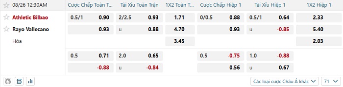 Bảng tỷ lệ kèo bóng đá Athletic Bilbao vs Rayo Vallecano