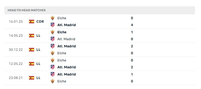 Lịch sử đối đầu Atletico Madrid vs Elche
