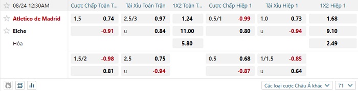 Bảng tỷ lệ kèo bóng đá Atletico Madrid vs Elche