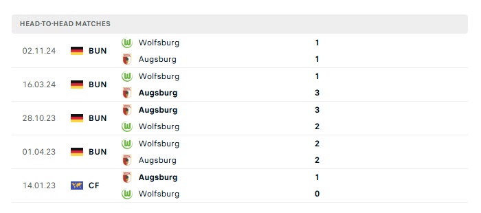 Lịch sử đối đầu Augsburg vs Wolfsburg