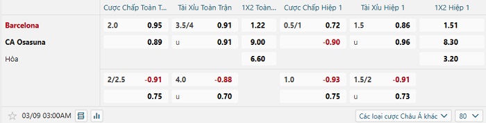 Bảng tỷ lệ kèo bóng đá Barcelona vs Osasuna