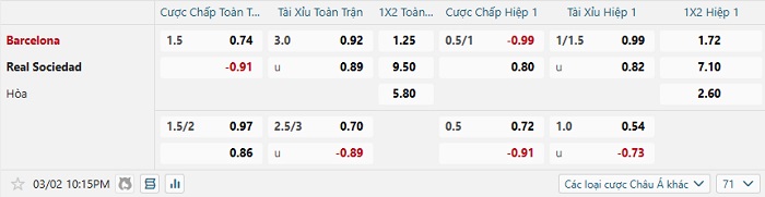 Bảng tỷ lệ kèo bóng đá Barcelona vs Real Sociedad