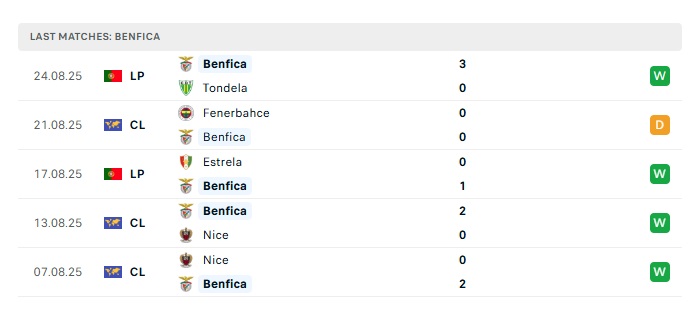 - Phong độ gần đây Benfica