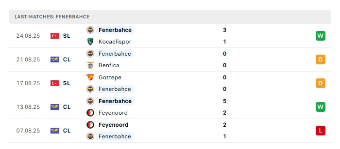 - Phong độ gần đây Fenerbahce