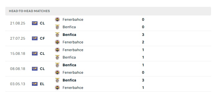 Lịch sử đối đầu Benfica vs Fenerbahce