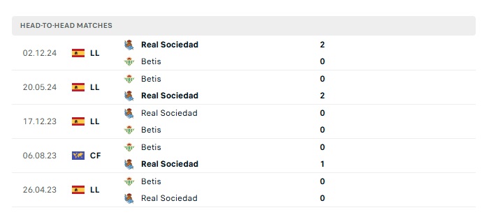 Lịch sử đối đầu Betis vs Real Sociedad