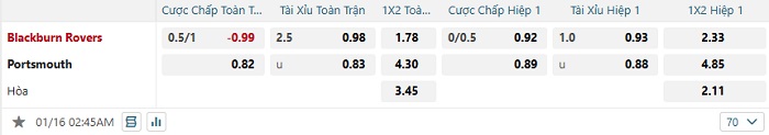 Bảng tỷ lệ kèo bóng đá Blackburn Rovers vs Portsmouth