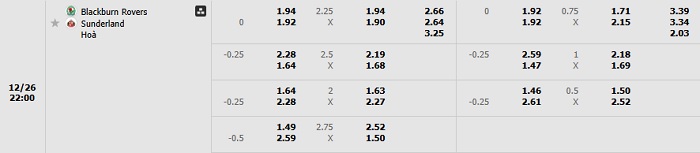 Bảng tỷ lệ kèo bóng đá Blackburn vs Sunderland