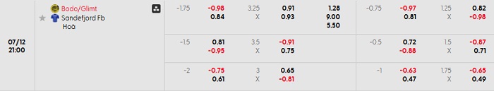 - Kèo tỷ số H1 Bodo Glimt vs Sandefjord: 2-0