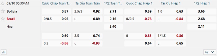 Bảng tỷ lệ kèo bóng đá hôm nay Bolivia vs Brazil