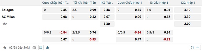 Bảng tỷ lệ kèo bóng đá Bologna vs AC Milan