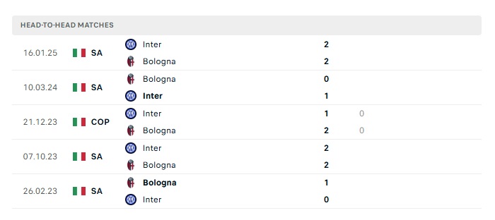 Tuy có phong độ đang rất cao, Bologna vẫn sẽ không dễ để có cho mình 1 điểm dù có lợi thế sân bãi. Ở 6 lần gần nhất Bologna đón tiếp Inter tại sân nhà, họ đã thua đến 4 và chỉ thắng đúng 2 trận. Song song đó thì ở 5 trận sân khách đã qua, Inter cũng đã có cho mình 3 chiến thắng và chỉ hòa 2. Do đó, kèo châu Âu trận đấu hôm nay sẽ có đội khách là lựa chọn an toàn nhất.