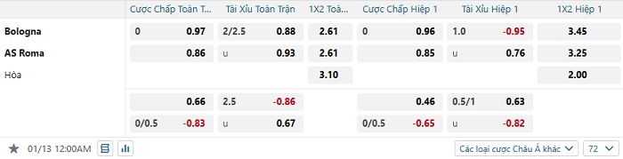 Bảng tỷ lệ kèo bóng đá Bologna vs Roma
