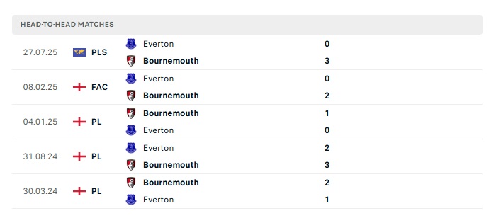 - Kèo tỷ số H2 Bournemouth vs Everton: 1-0