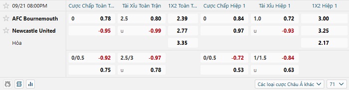 Bảng tỷ lệ kèo bóng đá hôm nay Bournemouth vs Newcastle