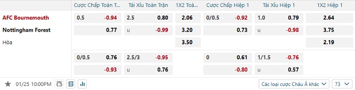 Bảng tỷ lệ kèo bóng đá Bournemouth vs Nottingham Forest