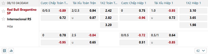 Bảng tỷ lệ kèo bóng đá Bragantino vs Internacional