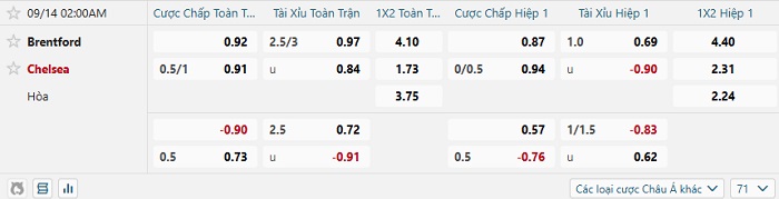 - Kèo tỷ số H1 Brentford vs Chelsea: 0-1