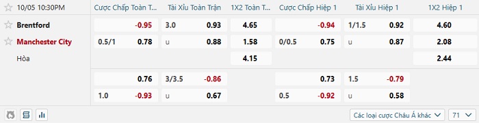 Bảng tỷ lệ kèo bóng đá hôm nay Brentford vs Man City