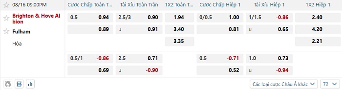 Bảng kèo bóng đá Brighton vs Fulham