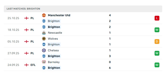 Theo các chuyên gia, Brighton hiện tại đang có sự bất ổn về phong độ và 3 điểm trước Leeds không phải nhiệm vụ dễ. Theo ghi nhận, Brighton lúc này đang có mặt ở vị trí thứ 13 trên BXH với 12 điểm sau 9 vòng. Trong khi đó thì Leeds cũng đang có 11 điểm cùng vị trí thứ 15. Như vậy thì rõ ràng, tân binh Leeds hôm nay vẫn sáng cửa có được 1 điểm tại sân của đối thủ.
