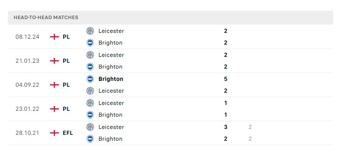 Lịch sử đối đầu Brighton vs Leicester City