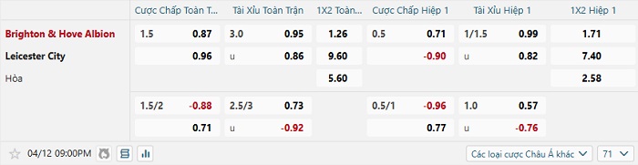 Bảng tỷ lệ kèo nhà cái Brighton vs Leicester City