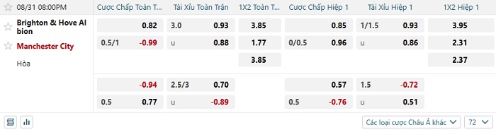 Hiện tại, nhà cái đang niêm yết cho Man City mức chấp -3/4 và khả năng họ thắng kèo là tương đối cao. Trên thực tế, 4 trận gần nhất có mở kèo của Brighton đã khép lại mà họ chỉ thắng 1, thua 3. Trong khi đó, Man City vẫn đang thắng kèo 4 và thua 2 trong 6 trận gần nhất. Do đó, kèo châu Á trận đấu hôm nay sẽ có đội khách là lựa chọn an toàn nhất dành cho người hâm mộ.