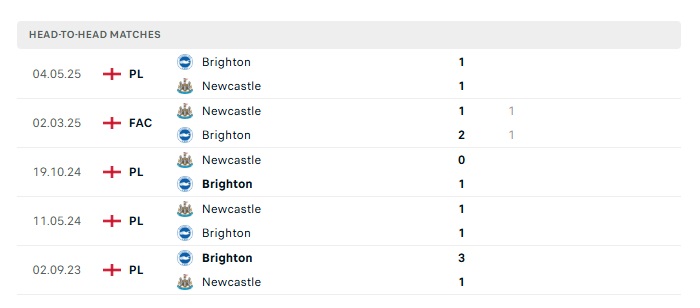 • Kèo tỷ số H2 Brighton vs Newcastle: 0-0
