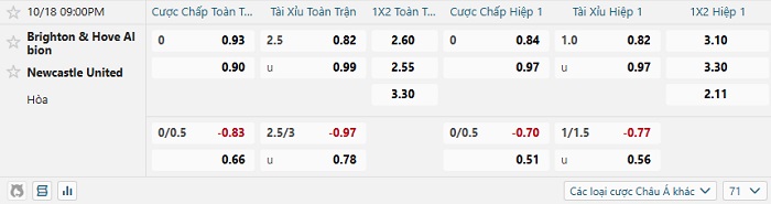 Bảng tỷ lệ kèo nhà cái Brighton vs Newcastle