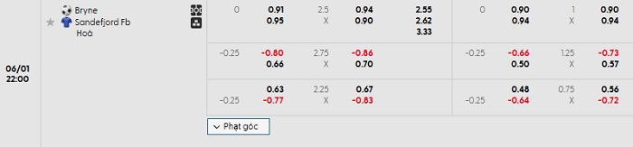 Bảng tỷ lệ kèo bóng đá hôm nay Bryne vs Sandefjord