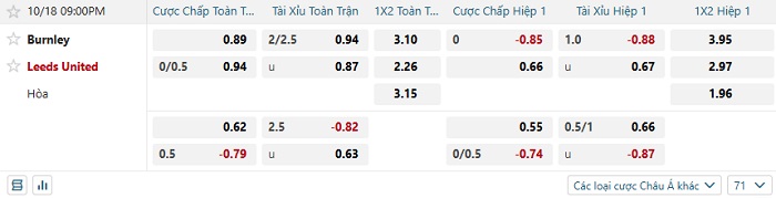 - Kèo tỷ số H2 Burnley vs Leeds Utd: 0-0