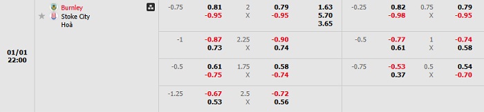 Bảng tỷ lệ kèo bóng đá Burnley vs Stoke City