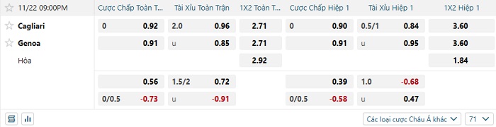 Soi kèo châu Á, kèo Cagliari vs Genoa