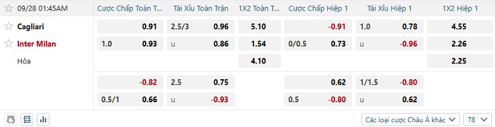Bảng kèo bóng đá Cagliari vs Inter Milan