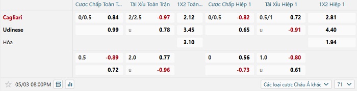 Soi kèo châu Á, kèo Cagliari vs Udinese