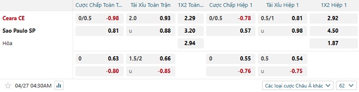 Bảng tỷ lệ kèo bóng đá hôm nay Ceara vs Sao Paulo